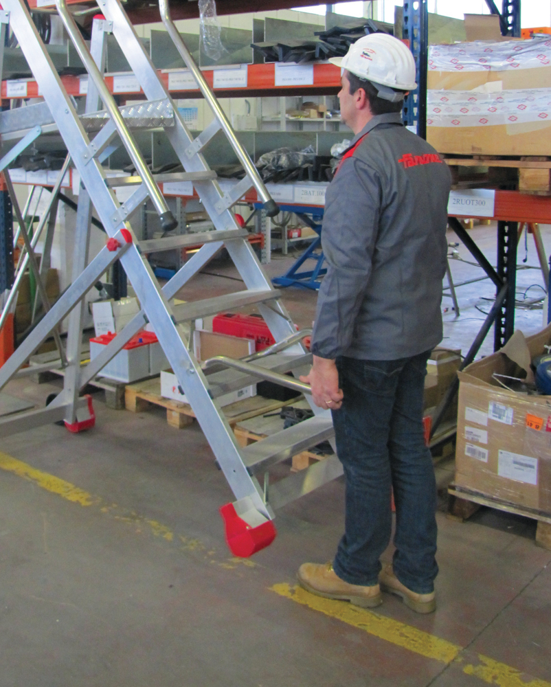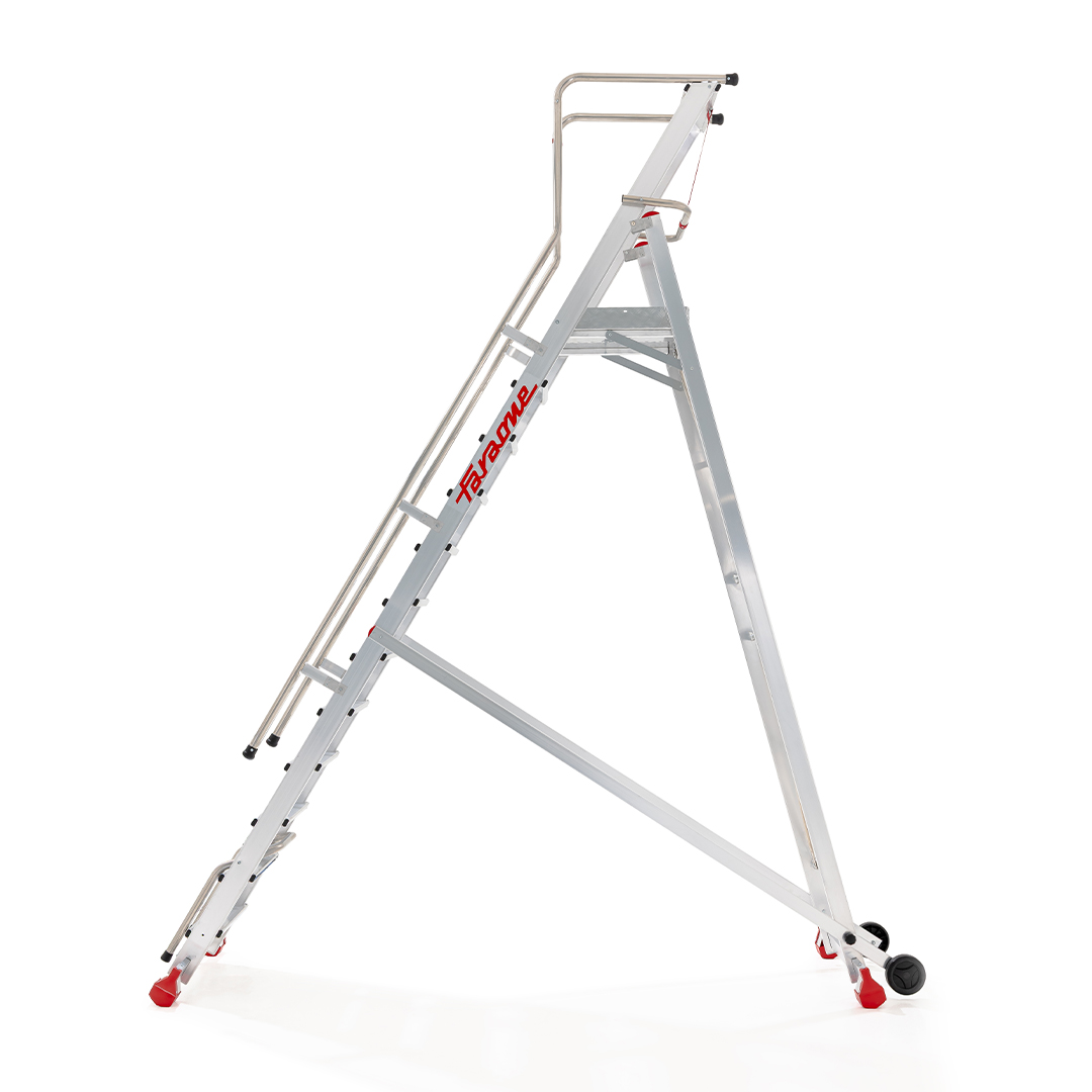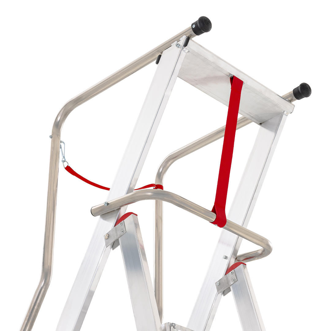 Podest wyposażony jest w antypoślizgowe stopnie, wygodne poręcze ochronne oraz platformę roboczą z barierkami, które zwiększają bezpieczeństwo operatora podczas pracy. Dzięki dwóm kołom jezdnym możliwe jest szybkie przestawianie podestu i jego stabilne unieruchomienie w miejscu pracy.