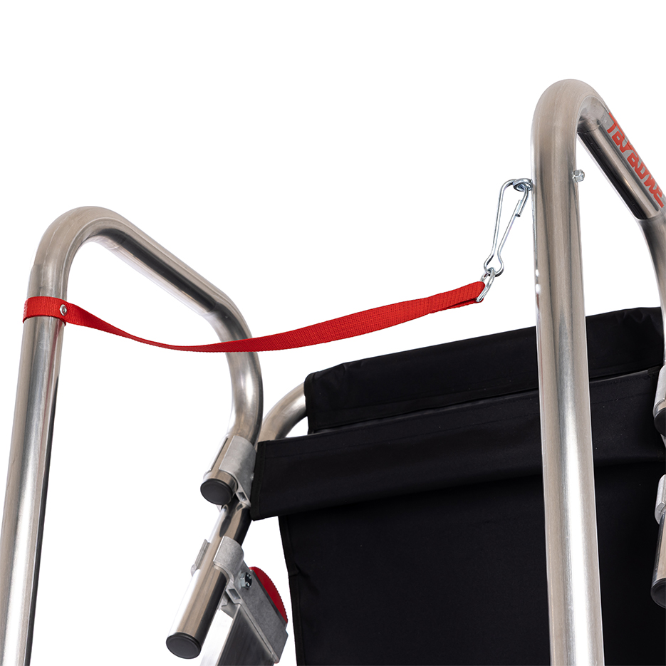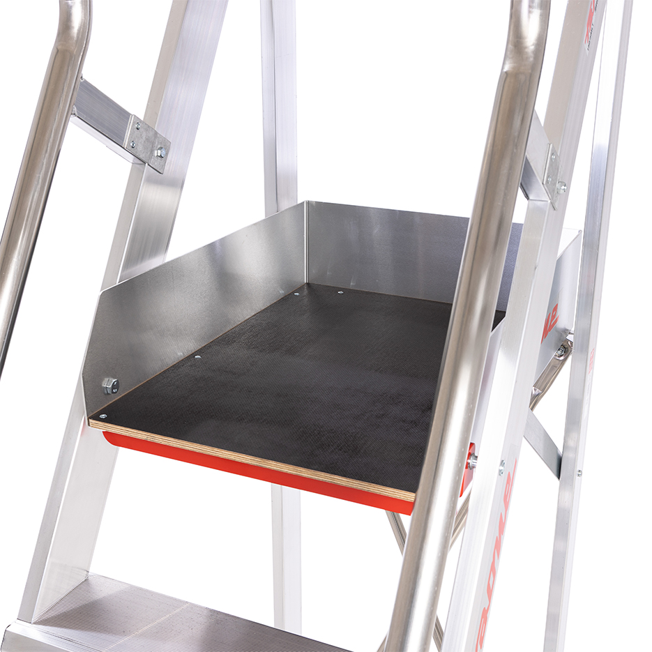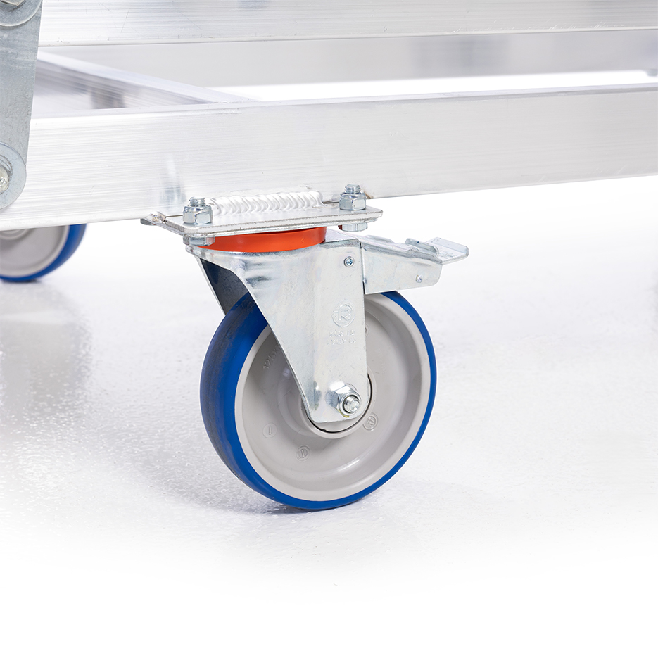 Drabina aluminiowa z barierkami i platformą roboczą. Stelaż drabiny stanowią kształtowniki o profilu zamkniętym. Podłużnice drabiny z przodu wykonane z wytrzymałych profili aluminiowych o przekroju 100 x 25 mm, ścianki dodatkowo pogrubione. Profil tylny o przekroju 80 x 25 mm. Wygodne przemieszczanie ułatwia wózek z automatyczną blokadą, zapewniający bezpieczne wejście na podest. Mechanizm zabezpieczenia opada automatycznie po wejściu na stopień.