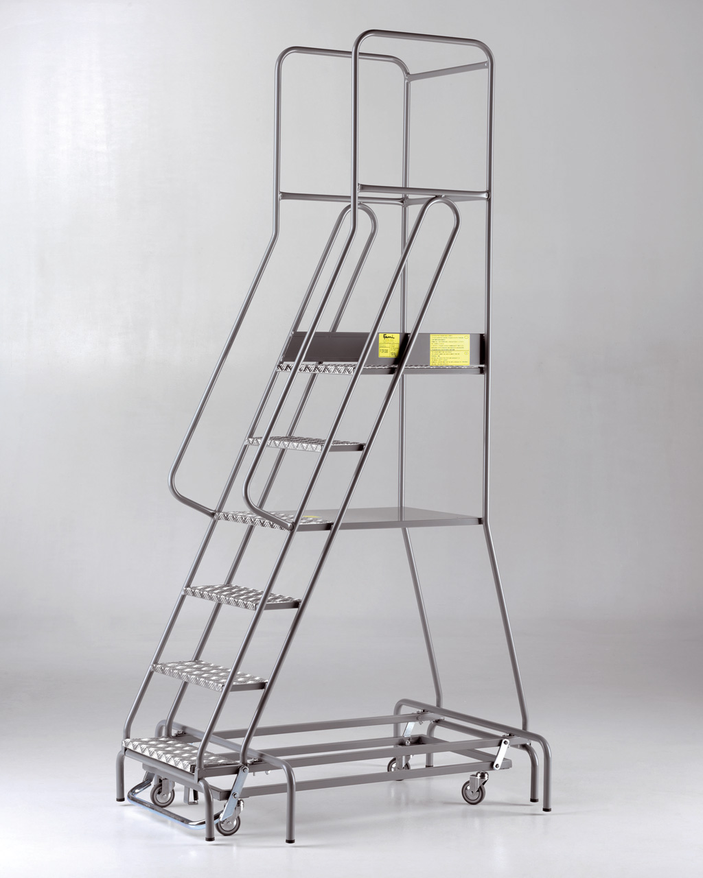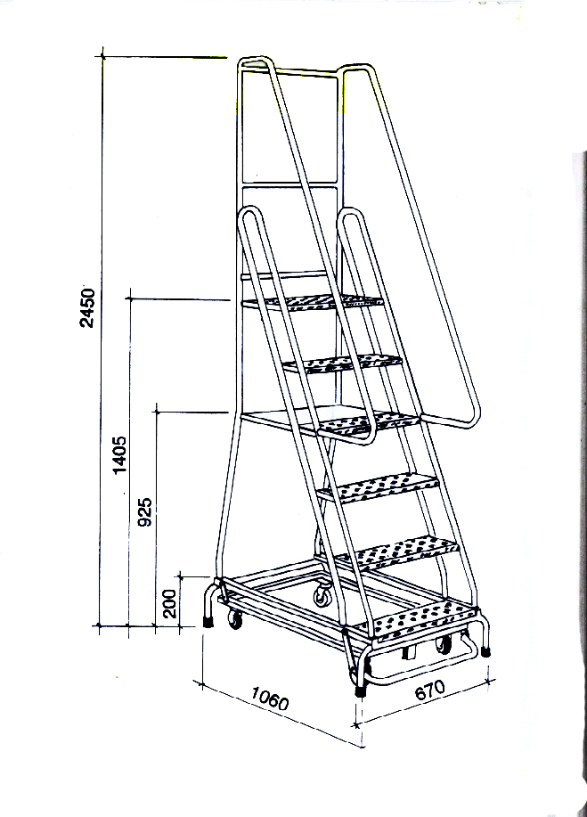 Drabina stalowa z barierkami i dużą platformą roboczą. Szerokie stopnie o ryflowanej powierzchni, pozwalają na wygodne wejście na platformę roboczą. Drabinę przemieszcza się na 4 samonastawnych kołach jezdnych. Po naciśnięciu na 1 stopień koła są podnoszone i drabina stabilnie spoczywa na 4 podporach wyposażonych w zaślepki z tworzywa. Aby ponownie przemieszczać drabinę należy nacisnąć nogą na mechanizm dźwigniowy wysuwający koła. Drabina posiada certyfikat TÜV.