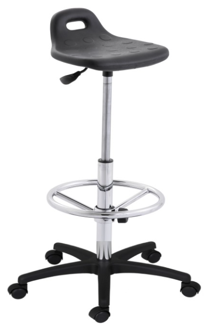 Wysoki hoker laboratoryjny stworzony z myślą o stanowiskach pracy z podwyższonymi blatami. Siedzisko jest miękkie, profilowane i antypoślizgowe, wykonane z poliuretanu o dużej odporności na uszkodzenia mechaniczne, działanie chemikaliów oraz wilgoć.