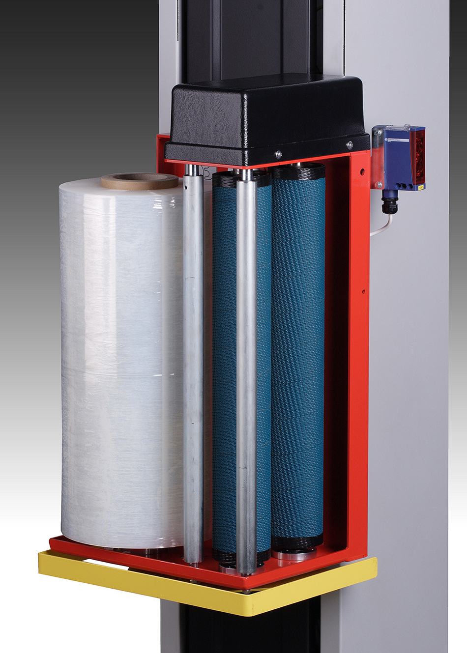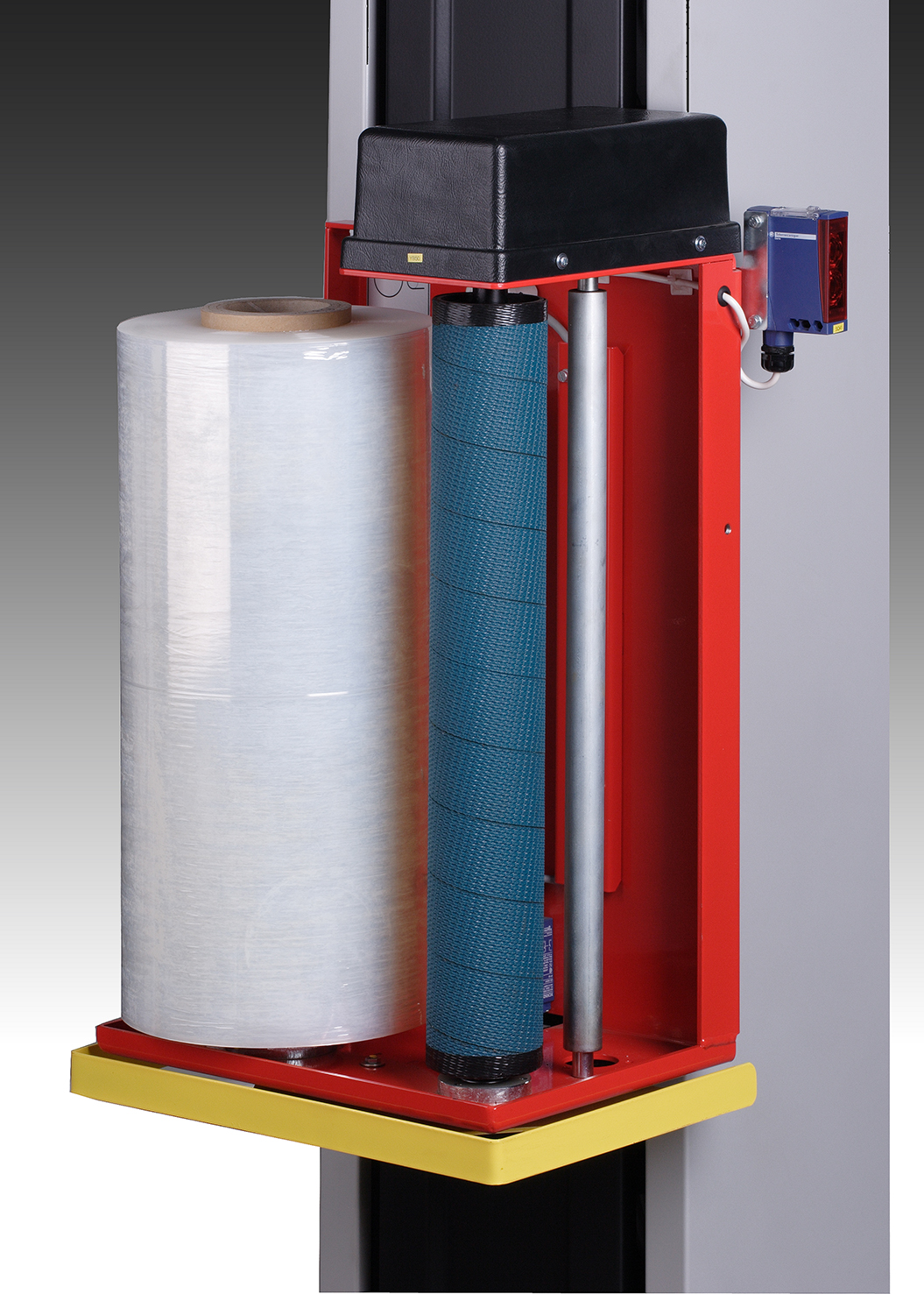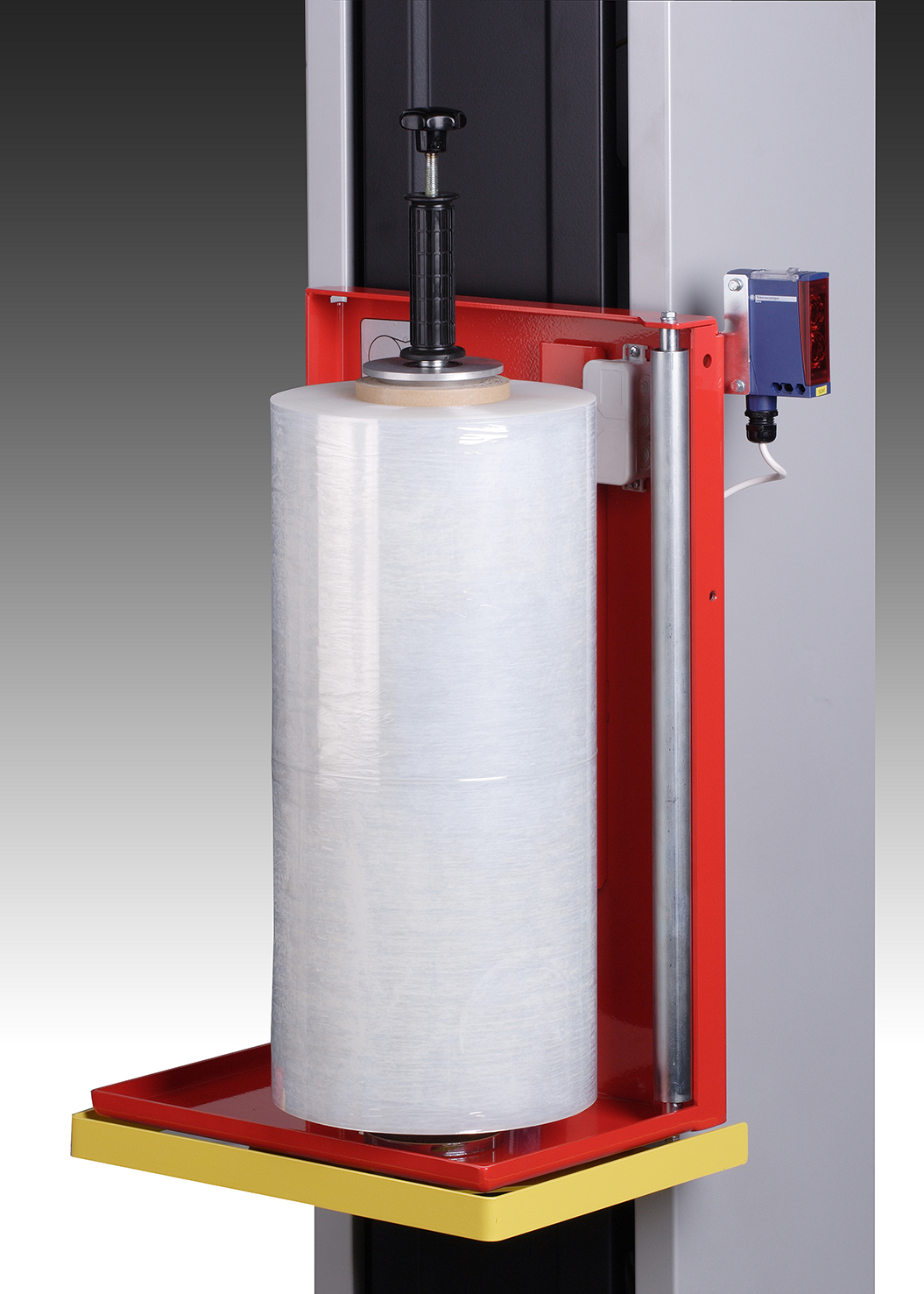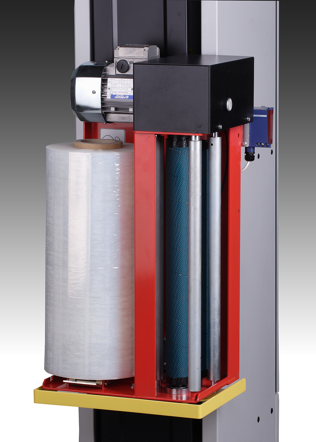 Maszyna wyposażona jest w obrotowy stół z wycięciem typu U, który umożliwia wygodny załadunek palety przy pomocy wózka paletowego, bez konieczności stosowania rampy. Pionowy maszt z wózkiem folii zapewnia płynne i równomierne owijanie ładunku na całej jego wysokości.