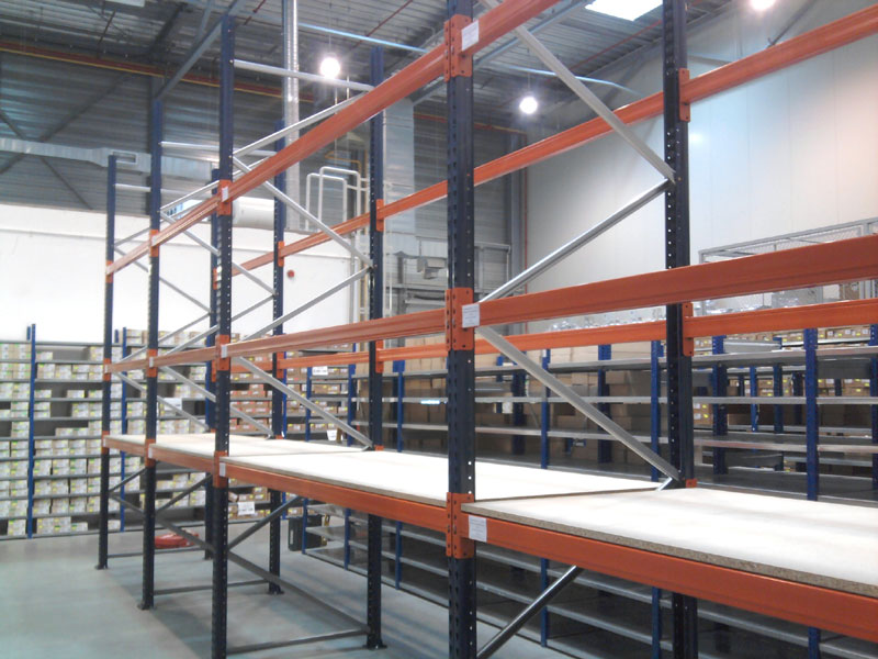 Regały paletowe można wyposażyć w półki z płyty wiórowej o grubości 18 lub 22 mm. Takie wypełnienie półek umożliwia składowanie drobnych elementów i nie przeszkadza to w składowaniu palet. Płyty można zainstalować na bezpośrednio na trawersach a dodatkowo zabezpieczyć od dołu wspornikami a na krawędziach ogranicznikami, które będą zapobiegać zsuwaniu się płyty. Drugim sposobem montażu jest ułożenie płyt na specjalnych wspornikach. Płyty spoczywają na nich i są zlicowane z trawersami. Udźwig półki zależy od ilości zastosowanych wsporników.